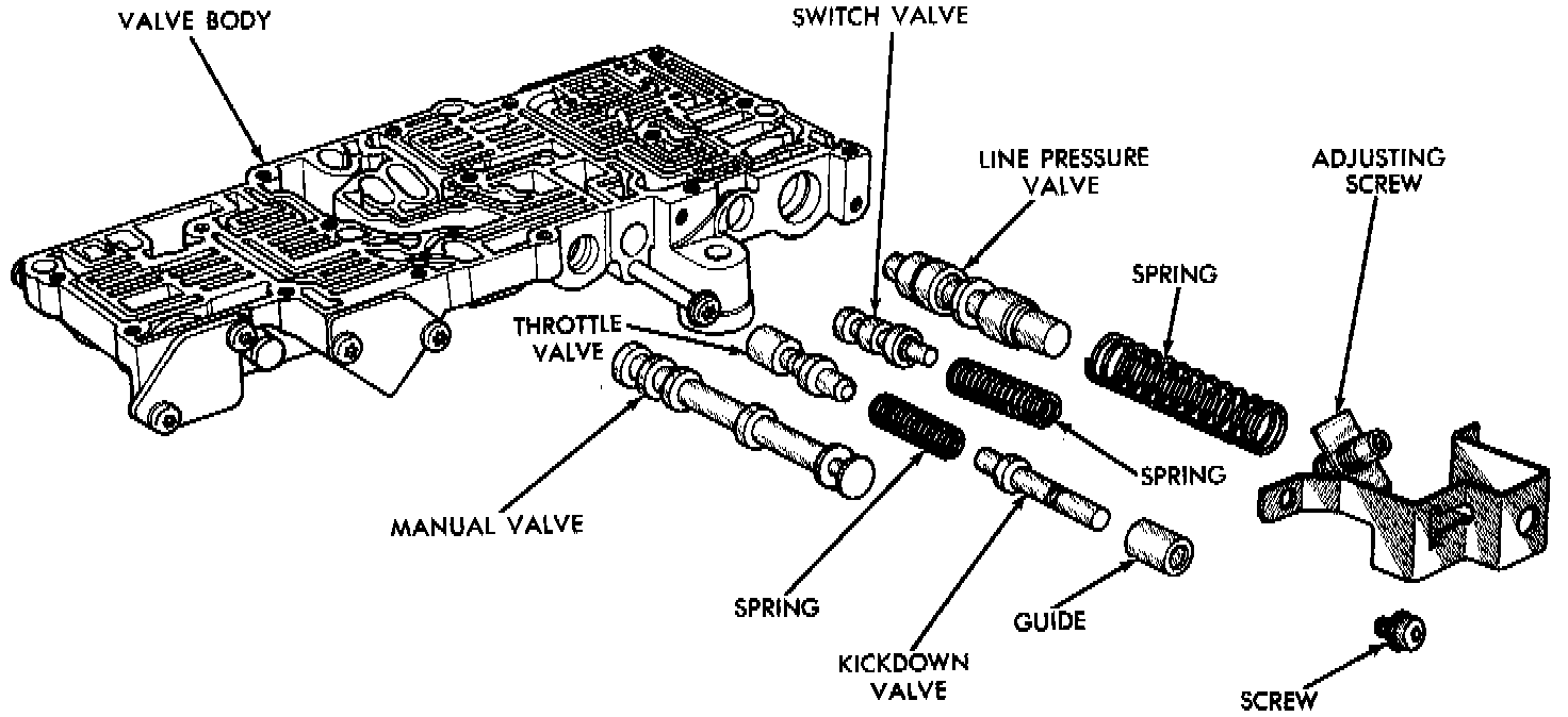 5. When bores, valves, and plugs are clean and dry, the valves and plugs should fall freely in the bores. The valve body bores do not change dimensionally with use. Therefore, a valve body that was functioning properly when vehicle was new, will operate correctly if it is properly and thoroughly cleaned. There is no need to replace valve body unless it is damaged in handling.