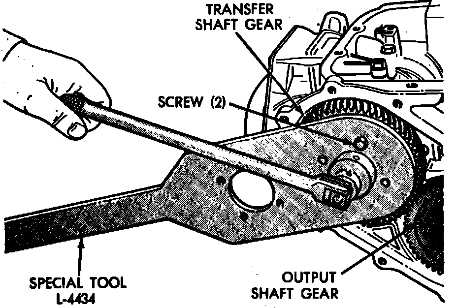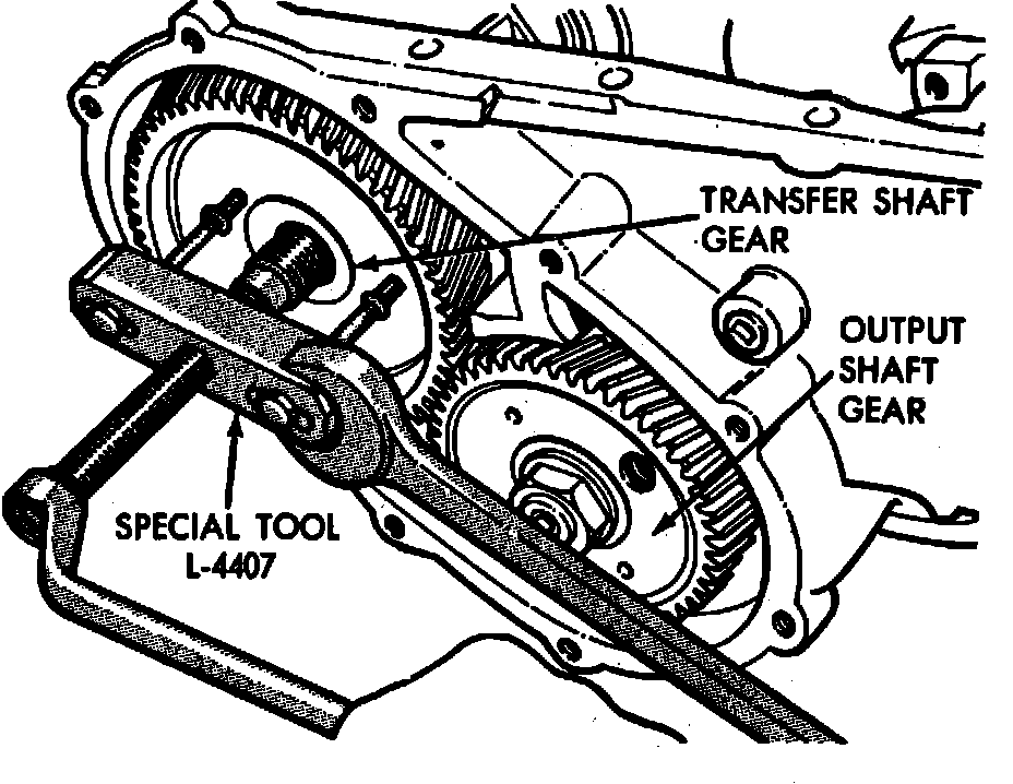 2. Using transfer shaft gear tool No. L-4434 or equivalent, remove transfer shaft gear retaining nut, Fig. 3.