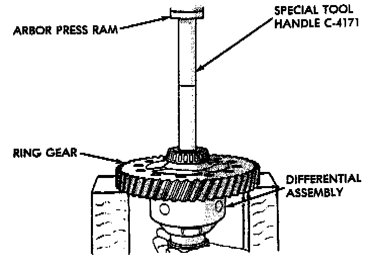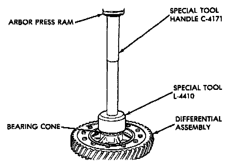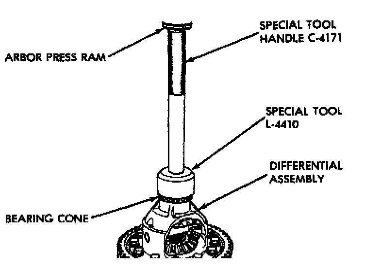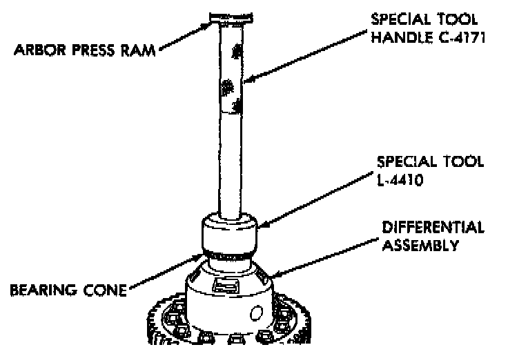 1. Take extreme care when removing and installing bearing cups and cones. Use only an arbor press for installation, as a hammer may not properly align the bearing cup or cone. Burrs or nicks on the bearing seat will give a false end play reading while gauging for proper shims. Improperly seated bearing cups and cones are subject to low mileage failure.
