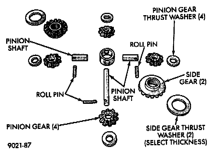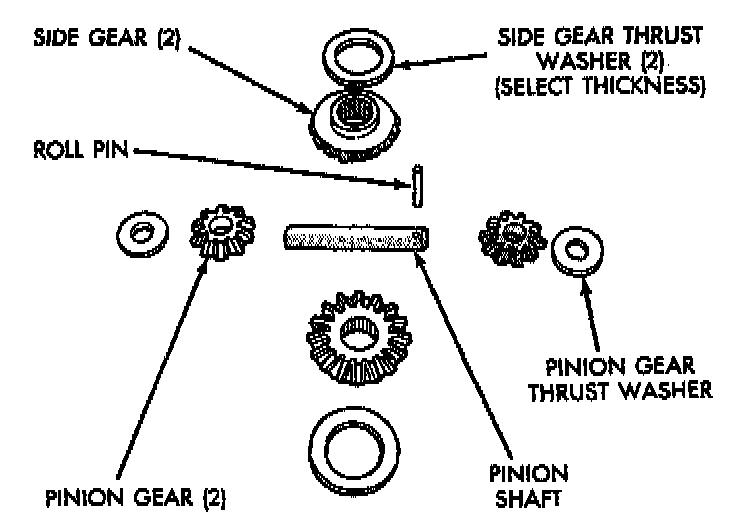 CAUTION: Side gear end play must be within 0.001 to 0.013 inch. Four select thrust washers are available: 0.032, 0.037, 0.042, and 0.047 inch.