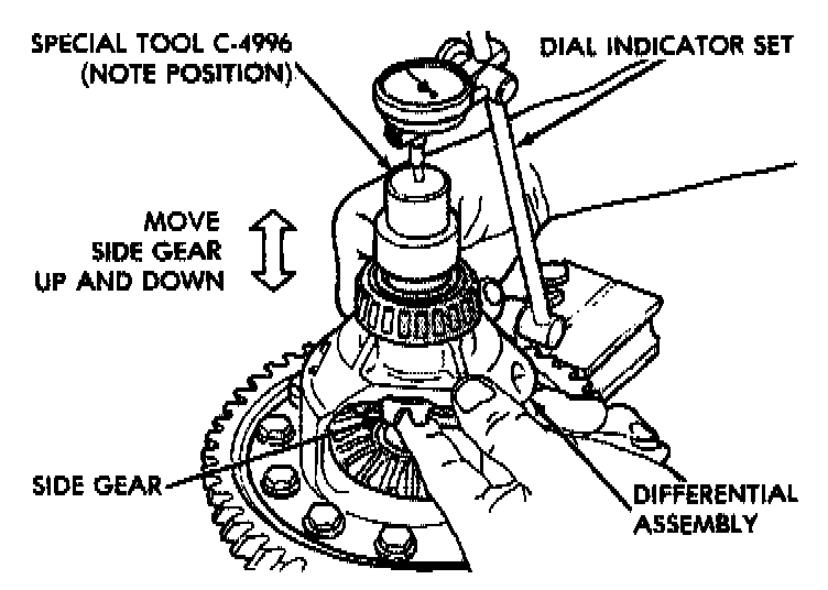 Using the smallest end play recorded, shim that side gear to within 0.001 to 0.013 inch. The other side gear should be checked using the same procedure.