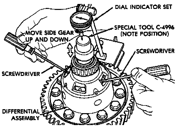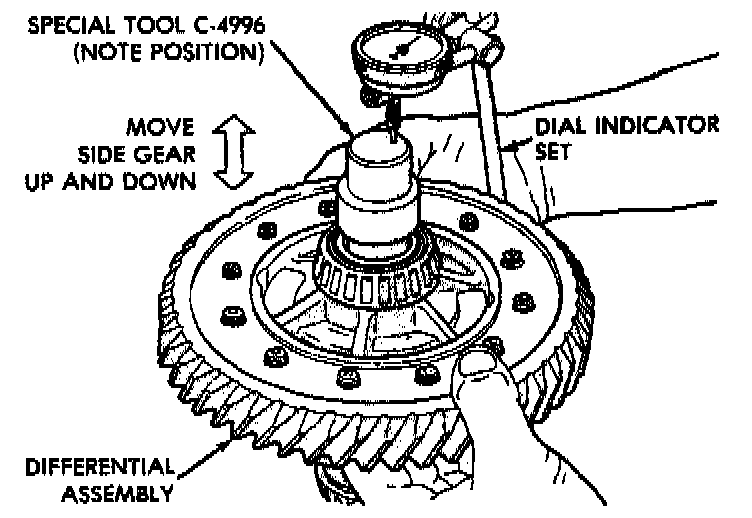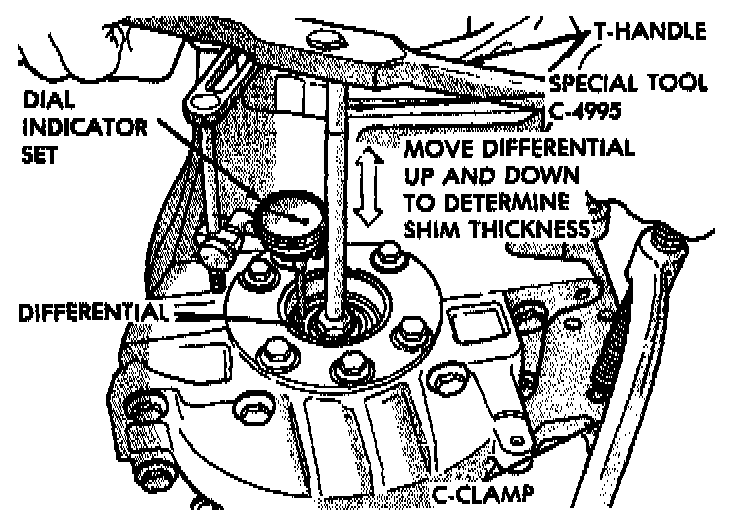 5. Apply a medium load to differential with Tool C-4995 and a T-Handle, in the downward direction. Roll differential assembly back and forth a number of times. This will settle the bearings. Zero dial indicator. To obtain end play readings, apply a medium load in the upward direction while rolling differential assembly back and forth. Record end play.