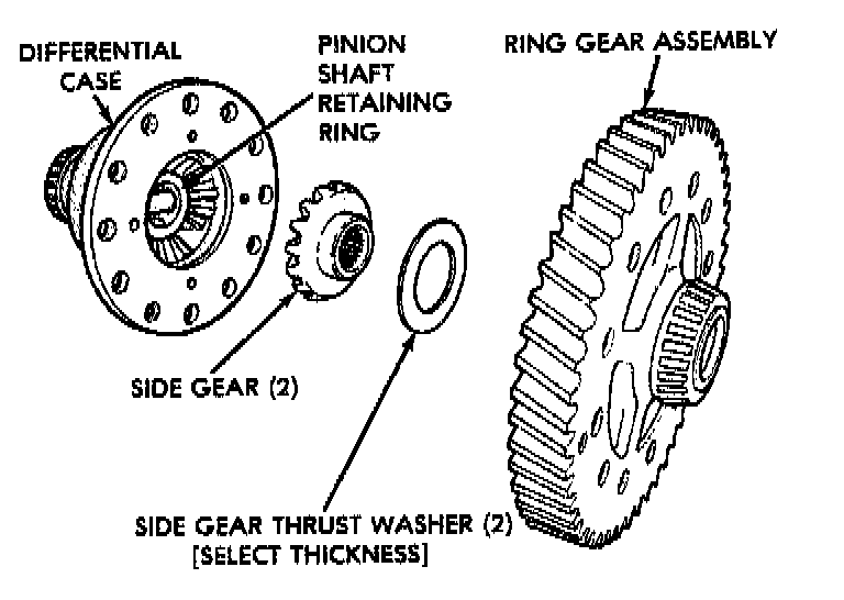 CAUTION: After reassembly of the differential assembly, insert the inner joint housing spline from a drive shaft into the side gear. By hand, turn the side gear with the joint housing spline. If the side gear will NOT turn, or it feels very tight, remove the ring gear and install a thinner side gear thrust washer.