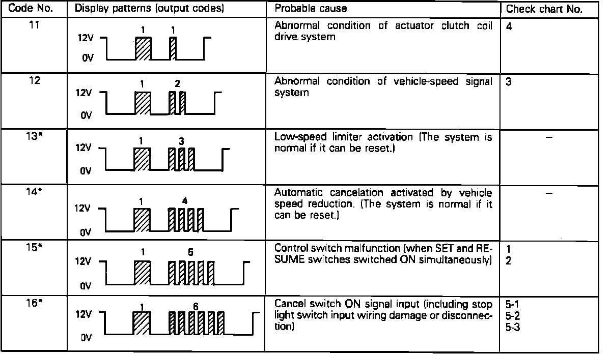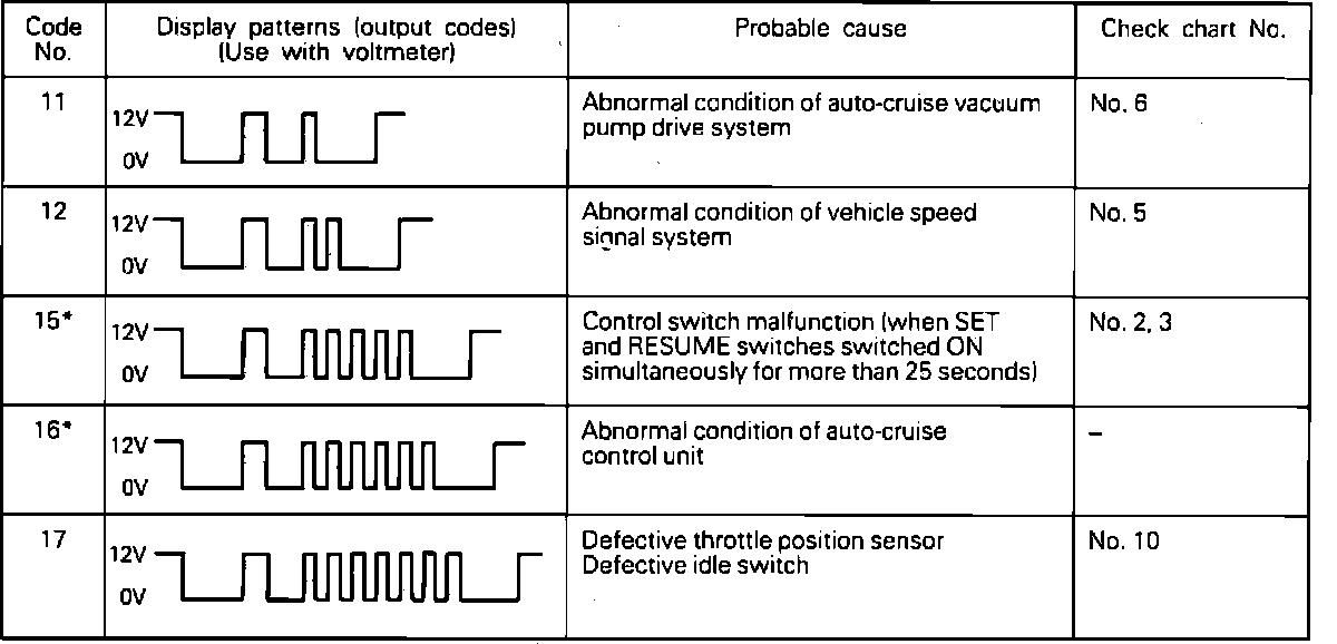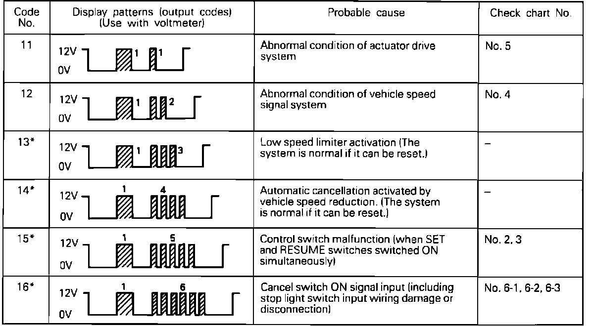 2. There are up to six cruise control related diagnostic codes, including one for normal condition. Check voltmeter readings with display patterns shown. Then refer to the appropriate Diagnostic Chart indicated. Refer to Cruise Control/Testing and Inspection/Procedures/Diagnostic Charts. Fault codes indicated by an asterisk can be caused by an intermittent condition. Check related connectors and wiring circuits.
