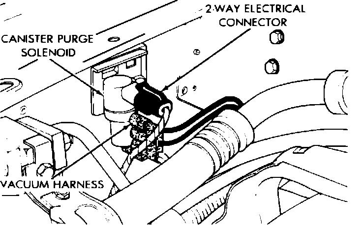 9. Disconnect Purge Solenoid electrical connector, and apply vacuum. Connect two jumper wires to the Purge Solenoid electrical terminals. Connect one from ground to one of the electrical terminals, and another from the battery to the other electrical terminal.