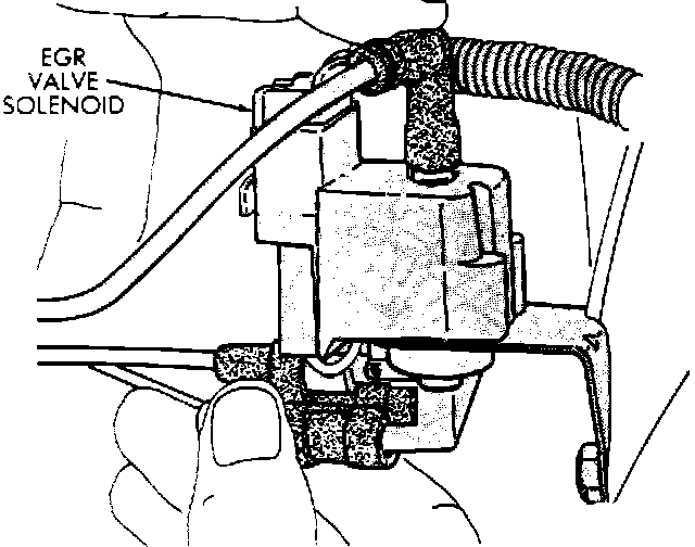 This solenoid is controlled by the ECU. The ECU monitors engine coolant temperature and other operating conditions to determine when to energize the EGR solenoid. This system does not allow EGR at idle, but does allow EGR at any temperature when the engine is above idle. When the ECU supplies a ground to the solenoid (energizing), vacuum is cut off from the EGR transducer. When the ECU removes the ground from the solenoid (de-energizing), vacuum is allowed to flow through the solenoid and out to the EGR transducer.