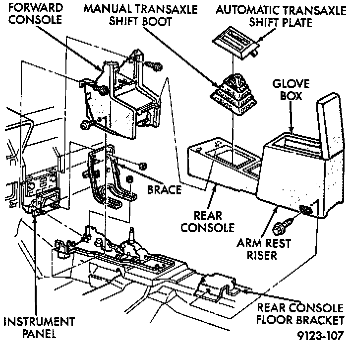 8. Remove screws holding forward console to lower instrument panel rail.