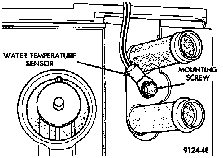 To install, reverse the preceding operation. When tightening the sensor mounting screw, allow the sensor to rotate and contact the upper heater hose nipple. This will aid in sensor efficiency.
