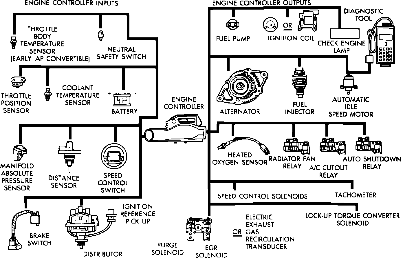 Various sensors provide necessary input for the SBEC to function correctly. These include the Manifold Absolute Pressure Sensor, Throttle Position Sensor, Oxygen Sensor, Coolant Temperature Sensor, Throttle Body Temperature Sensor, and Vehicle Distance Sensors. In addition to these sensors, various switches and relays are used to carry out commands or outputs from the SBEC.