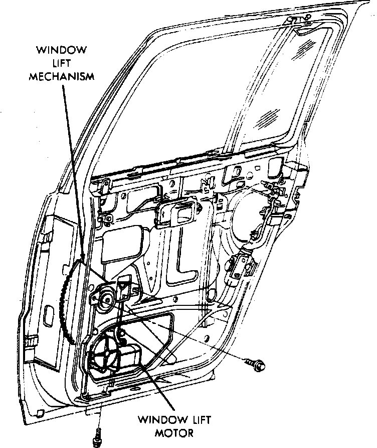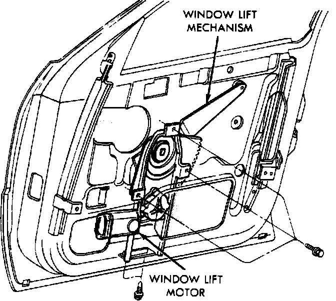 The window regulator is of a conventional sector gear design. The power window motor is attached to the window regulator. The window motor/regulator assembly is attached to the inner door panel of each door.