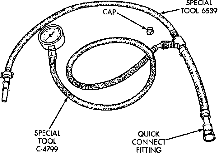 2. Carefully remove fuel supply hose from the engine fuel line assembly and connect fuel pressure gauge C-4799, and hose adapter C-6539 or equivalents between supply hose and fuel line assembly.