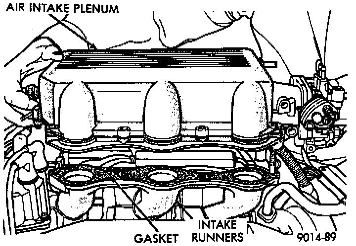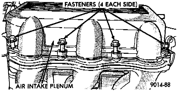 9. Remove air intake plenum to intake manifold attaching bolts, then air intake plenum.
