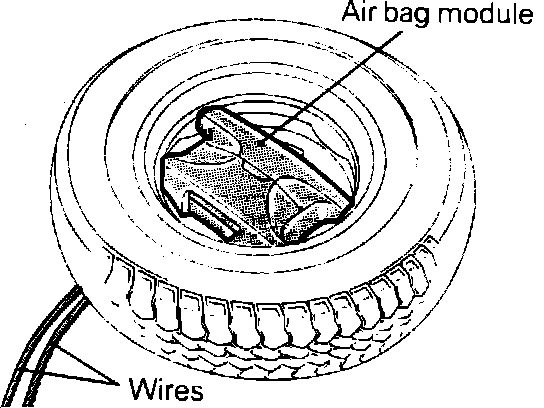 6. Pass adapter harness through a used tire and wheel and connect the harness to the airbag module. Using wires connected to bolts on module, secure airbag module to wheel and tire assembly keeping module pointed upward.