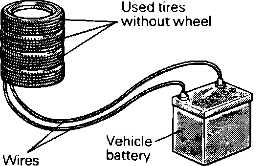 4. Connect two wires, each 20 feet or more long to the two leads of the SRS airbag adapter tool No. MB628919, and cover connections with tape. Twist other end of wires together to prevent an unexpected deployment of air bag.