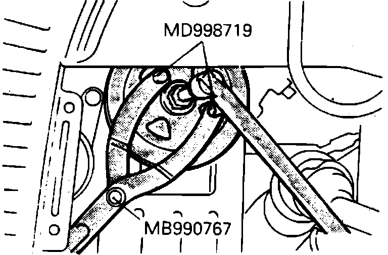 d. Remove crankshaft pulley using end yoke holder tool No. MB990767 and crankshaft pulley holder tool No. MB998719, or equivalent, as shown in Fig. 36.