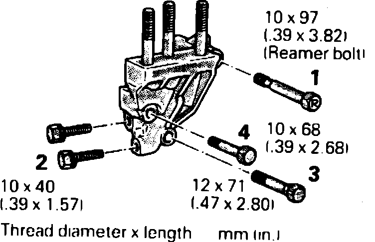c. Remove engine mount bracket in sequence shown in Fig. 35, lubricating reamer bolt indicated by arrow then remove bolt slowly. Reamer bolt is sometimes heat seized on engine support bracket.