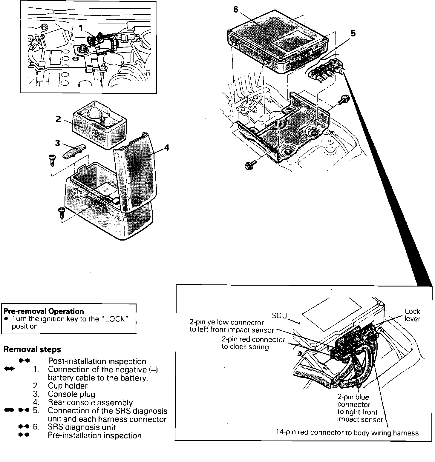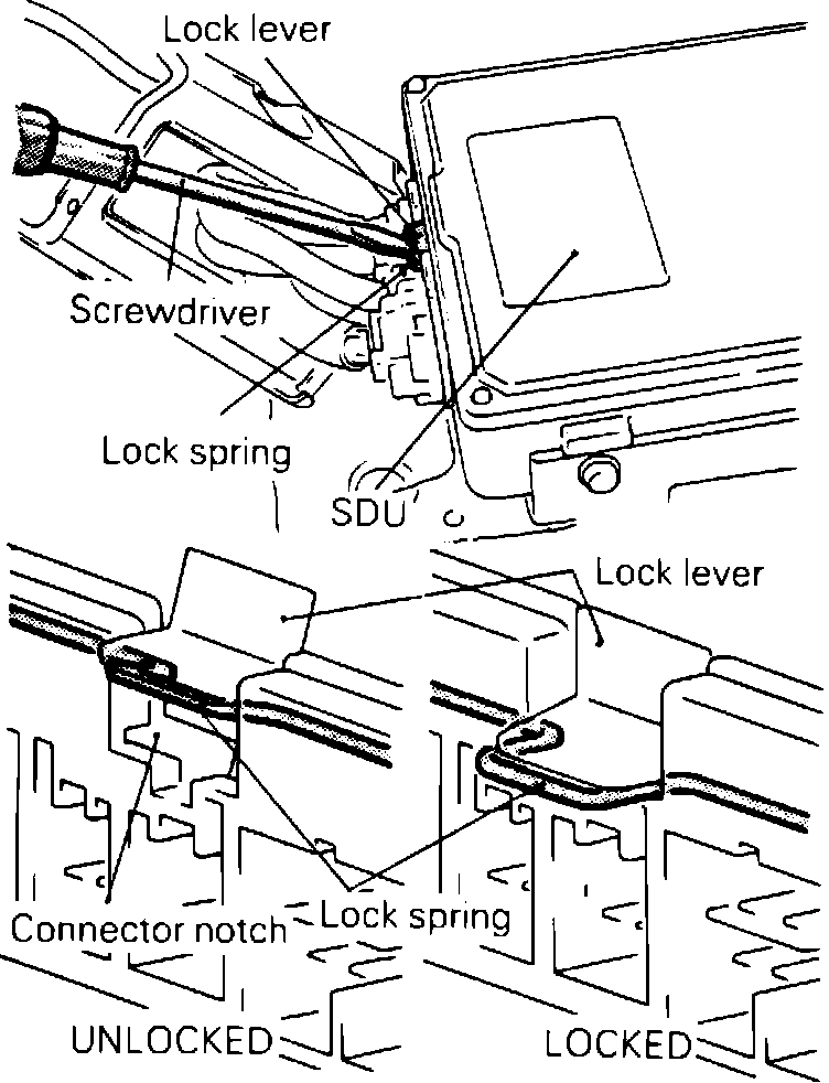 3. Disconnect SRS from SDU , using screwdriver to push in lock spring of lock lever. A double-lock connector is used, ensure care is taken not damage connector.