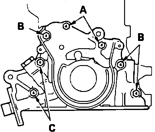 3. Reverse procedure to install. When installing timing case attaching bolts, refer to Figs. 9 and 10, and note that bolts installed in location A are 1.18 inches in length, bolts installed in location B are .79 inches in length and bolts installed in location C are 2.36 inches in length. When installing oil seal, lubricate seal lips with engine oil, then position seal on crankshaft and tap into timing case using seal installer tool No. MD998304 or equivalent. Before installing oil pan, apply sealer at the four front timing case and rear oil seal case to cylinder block mating surfaces.