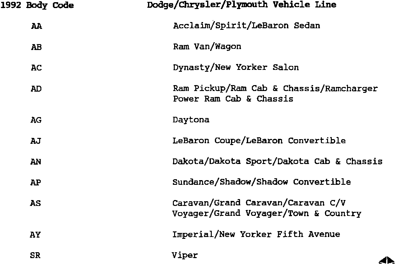 All vehicles in the 1992 Chrysler MOtors line-up have been assigned a two-character body code, (example: AA - Body) instead of the model name, (example: Spirit). Using body codes in the Technical Service Bulletins helps clarify which vehicles are being addressed in the bulletin.