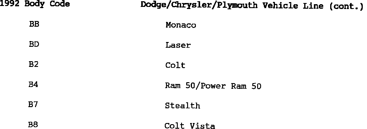 The body codes apply to 1992 vehicles. Please display this information in an area where all affected personnel can make reference to it and become familiar with the body codes.