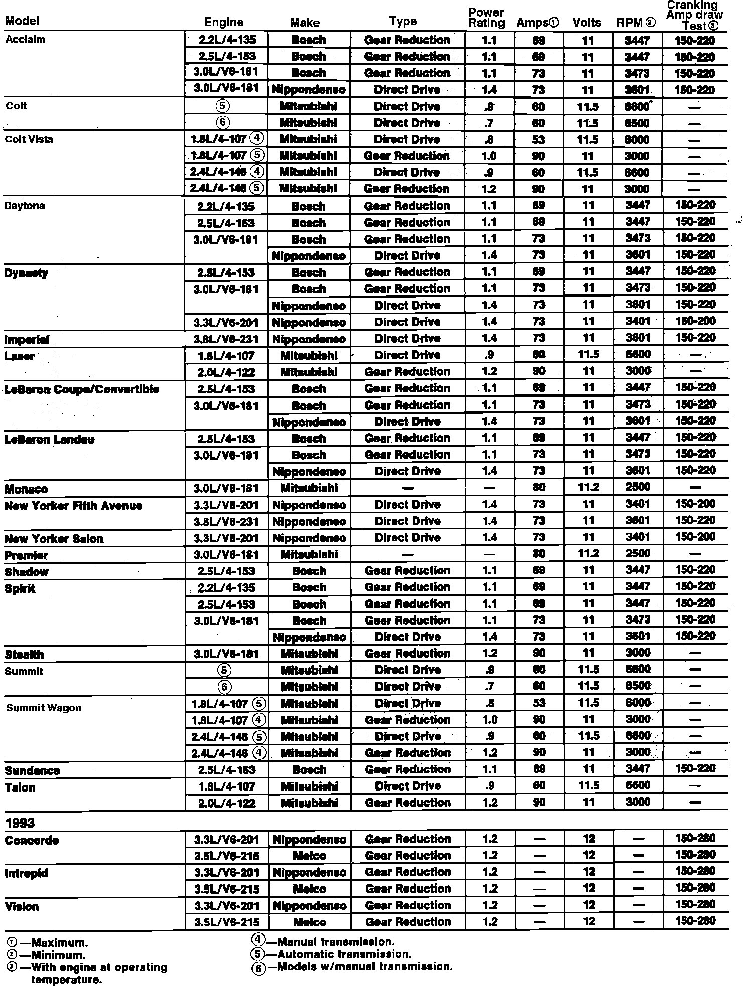 Starter Motor Specifications: