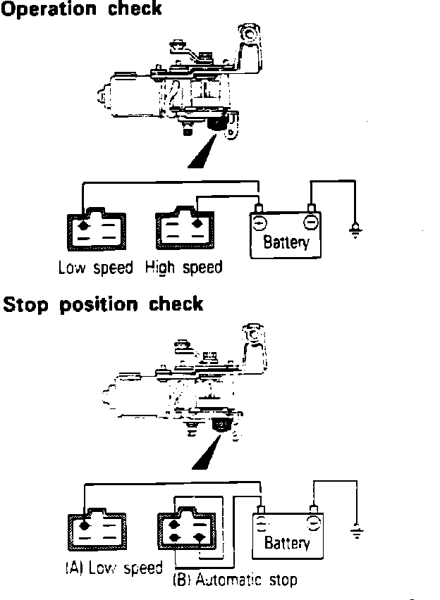 Ensure washer tank is full, then connect battery as shown in ensure water squirts out strongly. Replace motor if necessary.