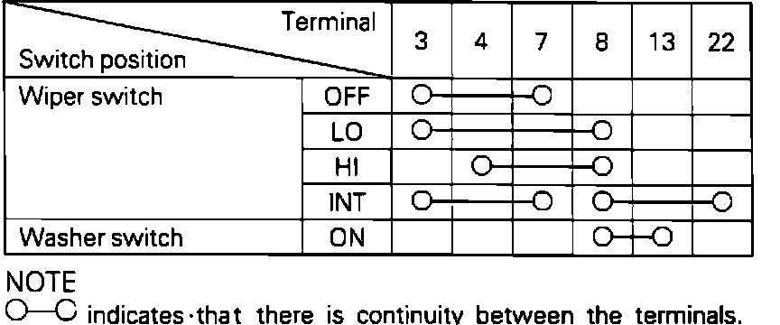With column switch connected, ignition switch in ACC position, wiper switch in INT position, check voltage between terminal three and ground. Voltage should alternate from zero to system volts.