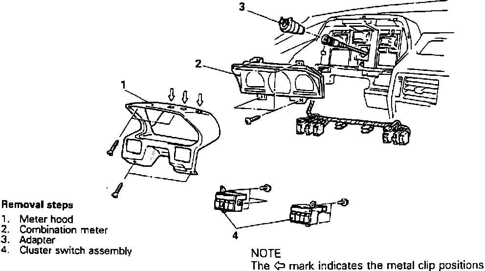 4. On 1992 Colt Vista and Summit Wagon models, remove hood lock release handle, instrument panel undercover and meter hood.
