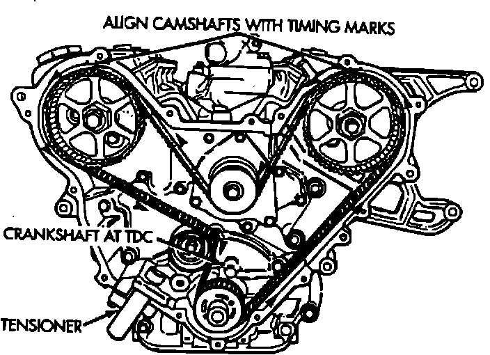 7. Align the camshafts following the procedure outlined in the service manual under "Camshaft and Timing Belt - Installation and Timing Procedure" page 9-44.