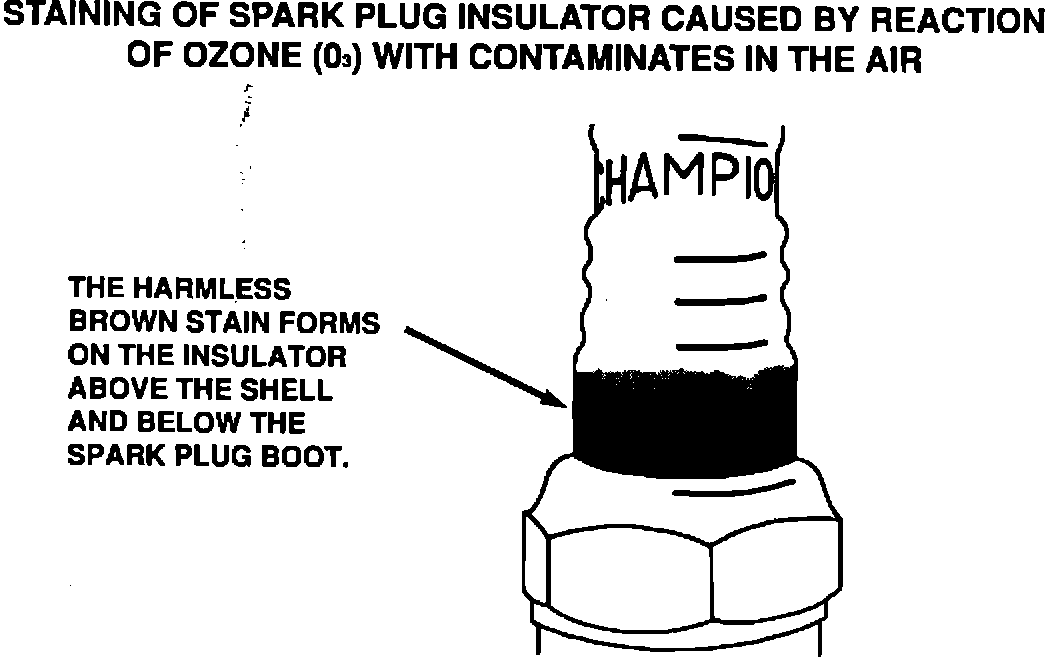 The ignition system generates a corona in the area of the spark plug not covered by the spark plug boot. The electrical capacitance of the spark plug creates an electrical field in the region of the spark plug. The electrical field generates ozone from the air. Ozone is a very active form of oxygen that will combine with ever present contaminates that form the harmless brown stain.