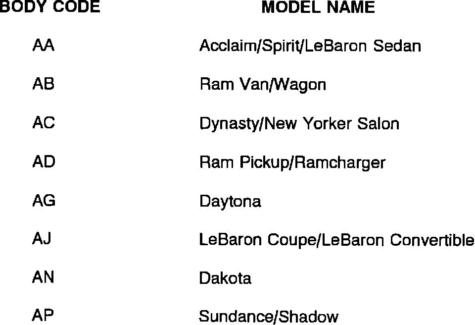 All vehicles in the 1993 Chrysler Motors line-up have been assigned a two-character body code, (example: AA - Body) instead of the model name, (example: Spirit). Using body codes in the Technical Service Bulletins helps clarify which vehicles are being addressed in the bulletin.