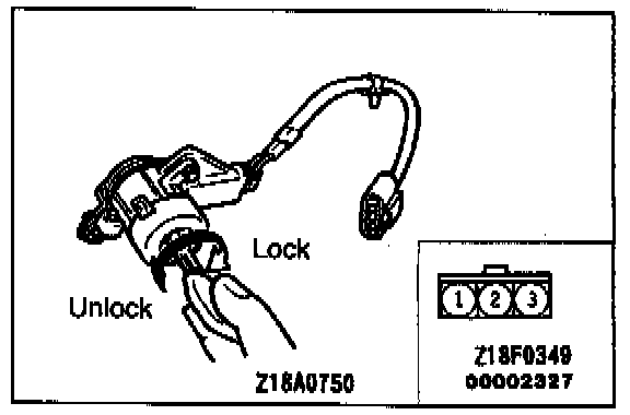 Insert the key and turn it to the LOCK or UNLOCK position to check for continuity as follows: