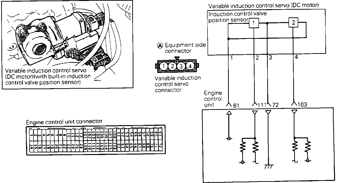 Testing procedures for the Induction Control Valve Position Sensor are not provided. If the following harness test procedure is followed, the sensor can be tested by process of elimination.