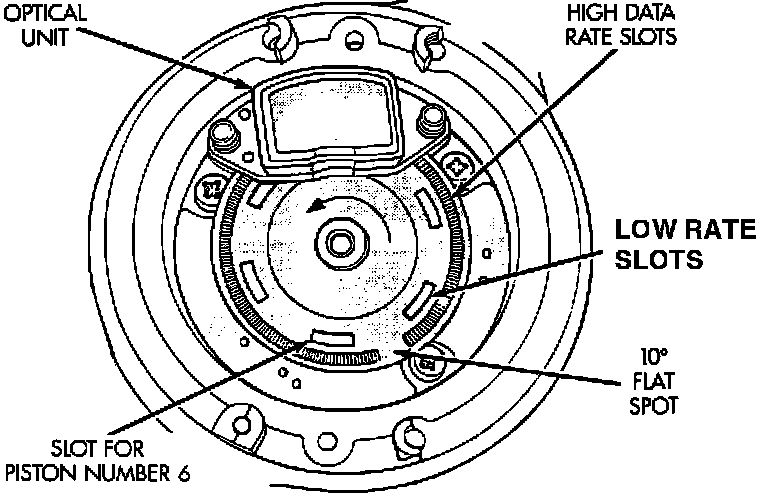 The outer or "high data rate", slots pass through the corresponding optical sensor 1 slot per 2 degrees of crankshaft rotation.