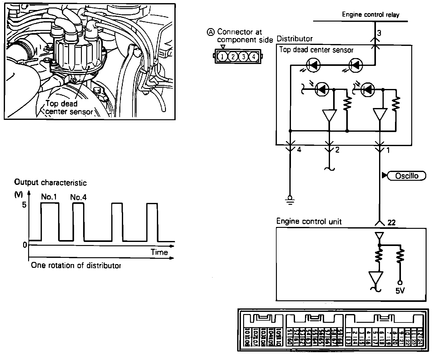 1. Connect test leads from the oscilloscope to the #1 terminal of the sensor connector and run the engine at idle speed.
