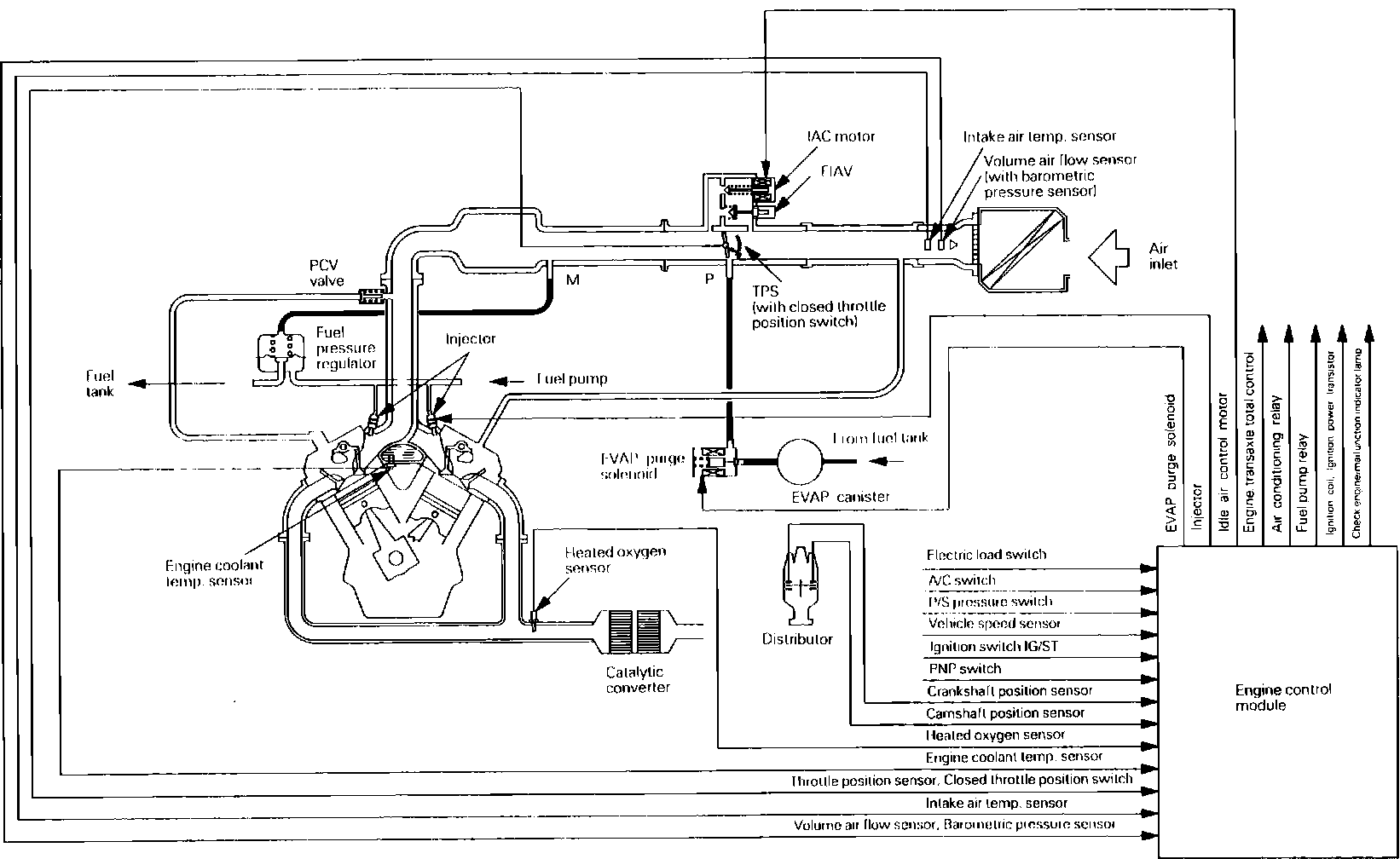 The Mitsubishi electronically controlled multipoint injection system (ECI-MULTI) maintains emission levels and fuel economy within government agency standards, while optimizing driveability. The system consists of an Electronic Control Module (ECM), control relay, wiring, sensors and actuators.