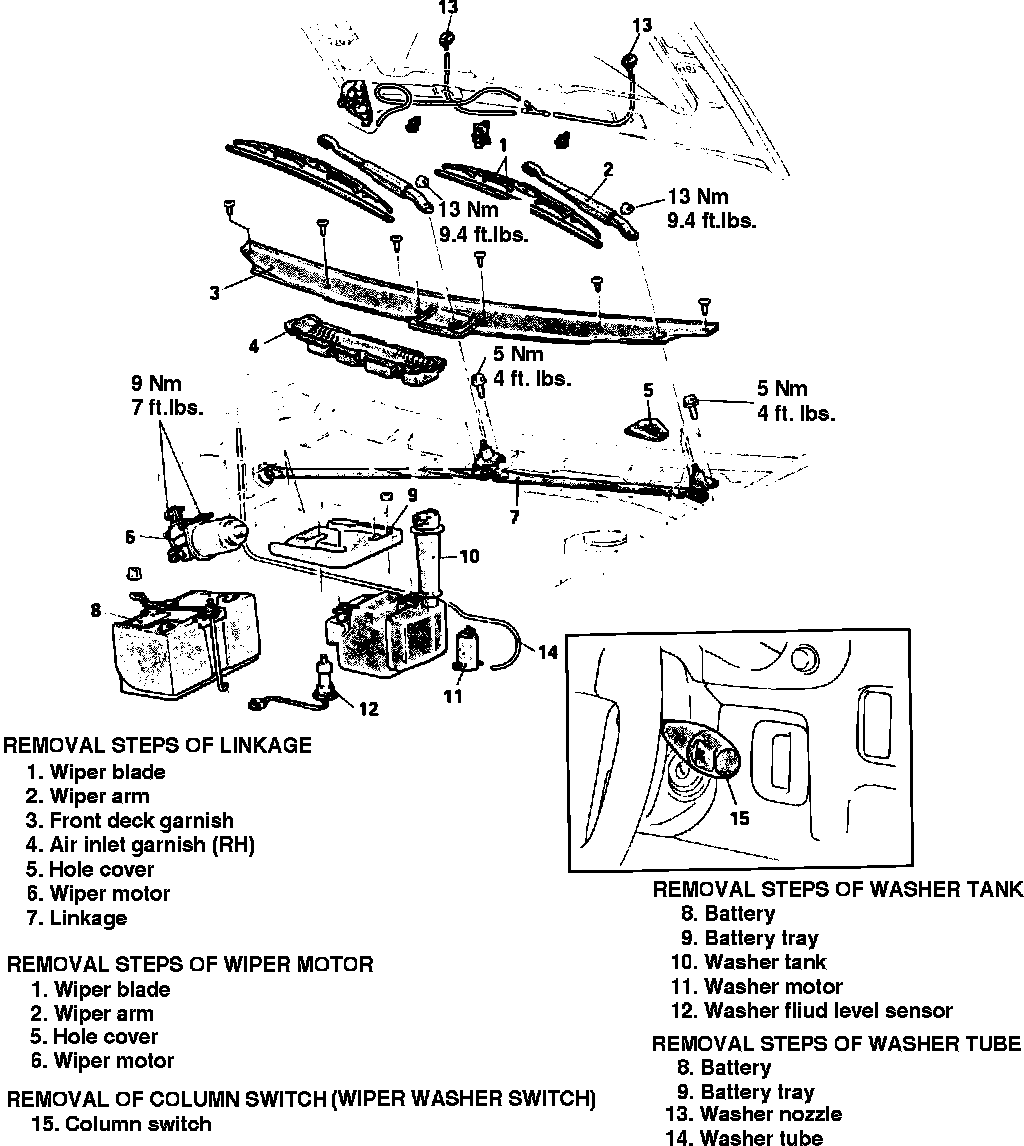 6. Reverse procedure to install. Torque wiper motor attaching bolts to 7 ft lbs. Torque wiper arm attaching nuts to 9.4 ft lbs.