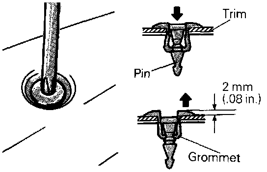 1. Use a cross-tip (+) screwdriver to push inward the pin (at the center of the clip) to a depth of about 2 mm (.08 in.).