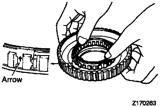 1. Push the one-way clutch into the outer race. Make sure that arrow on the outside circumference of cage is directed upward as shown in the illustration when the one-way clutch is pushed in.