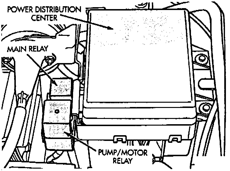The main relay and pump motor relay are serviced as an assembly with the relay mounting bracket. The relay bracket is mounted to the side of the power distribution center (PDC).