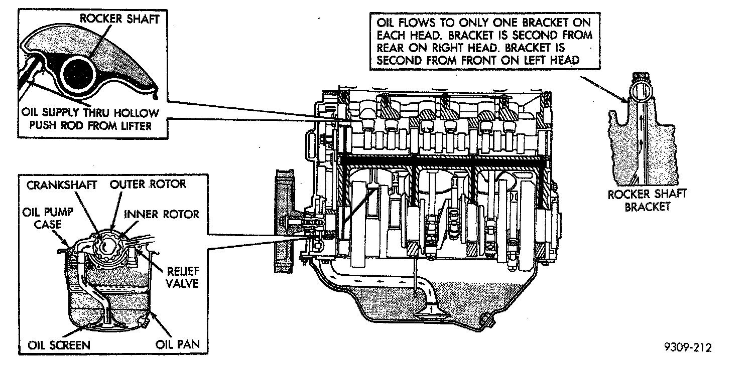 The lubrication system is a full flow filtration pressure feed type. Oil, stored in the oil pan, is taken in and discharged by a gerotor type oil pump directly coupled to the crankshaft and its pressure is regulated by a relief valve. The oil is fed through an oil filter and to the crankshaft journals from the oil gallery in the cylinder block. This gallery also feeds oil under pressure to the cylinder heads. It then flows to each cylinder head through passages to camshaft journals, the rocker shafts to the rocker arms, hydraulic lash adjusters.