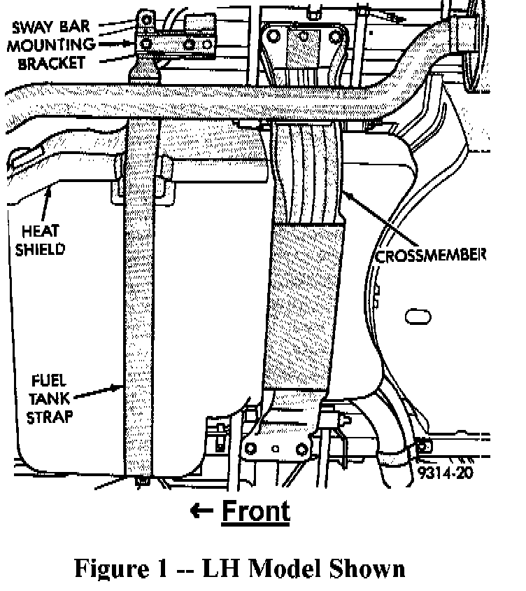 8. For LH vehicles: Remove the four fuel tank mounting strap bolts and then carefully remove the fuel tank strap and sway bar brackets (Figure 1).