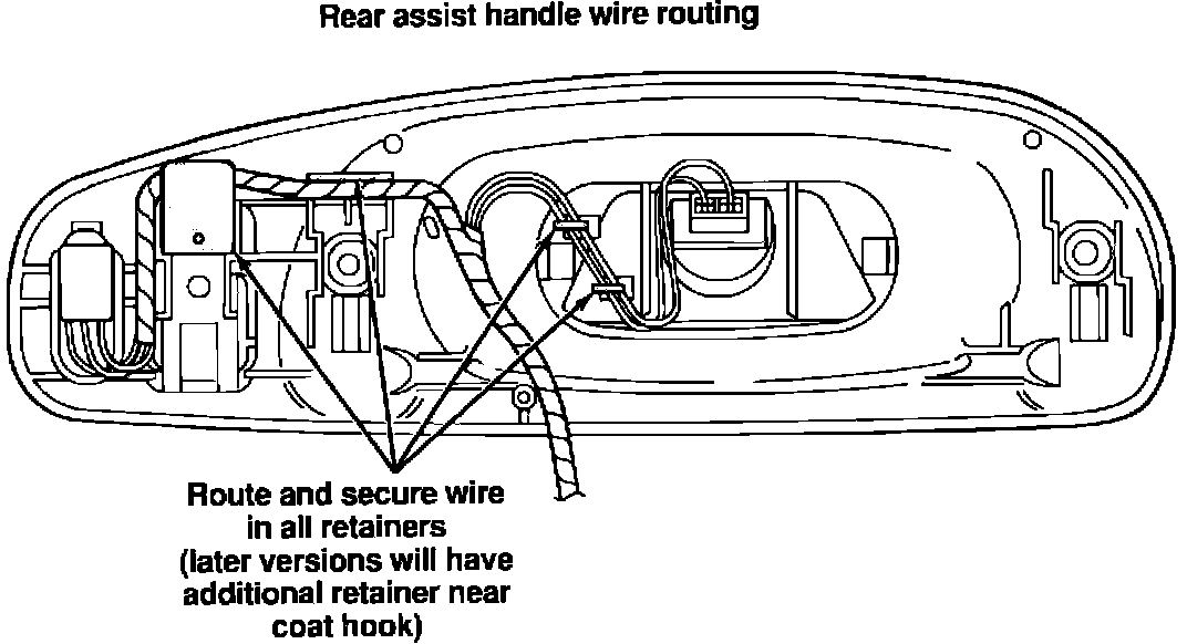 A reading lamp and switch are incorporated into the rear assist handles. Anytime it is necessary to remove the assist handle for component service, care must be taken to route and install the wiring properly to the back side of the assist handle. Failure to do this could result in abrasion damage to the wiring from the roof sheetmetal or assist handle mounting screws.
