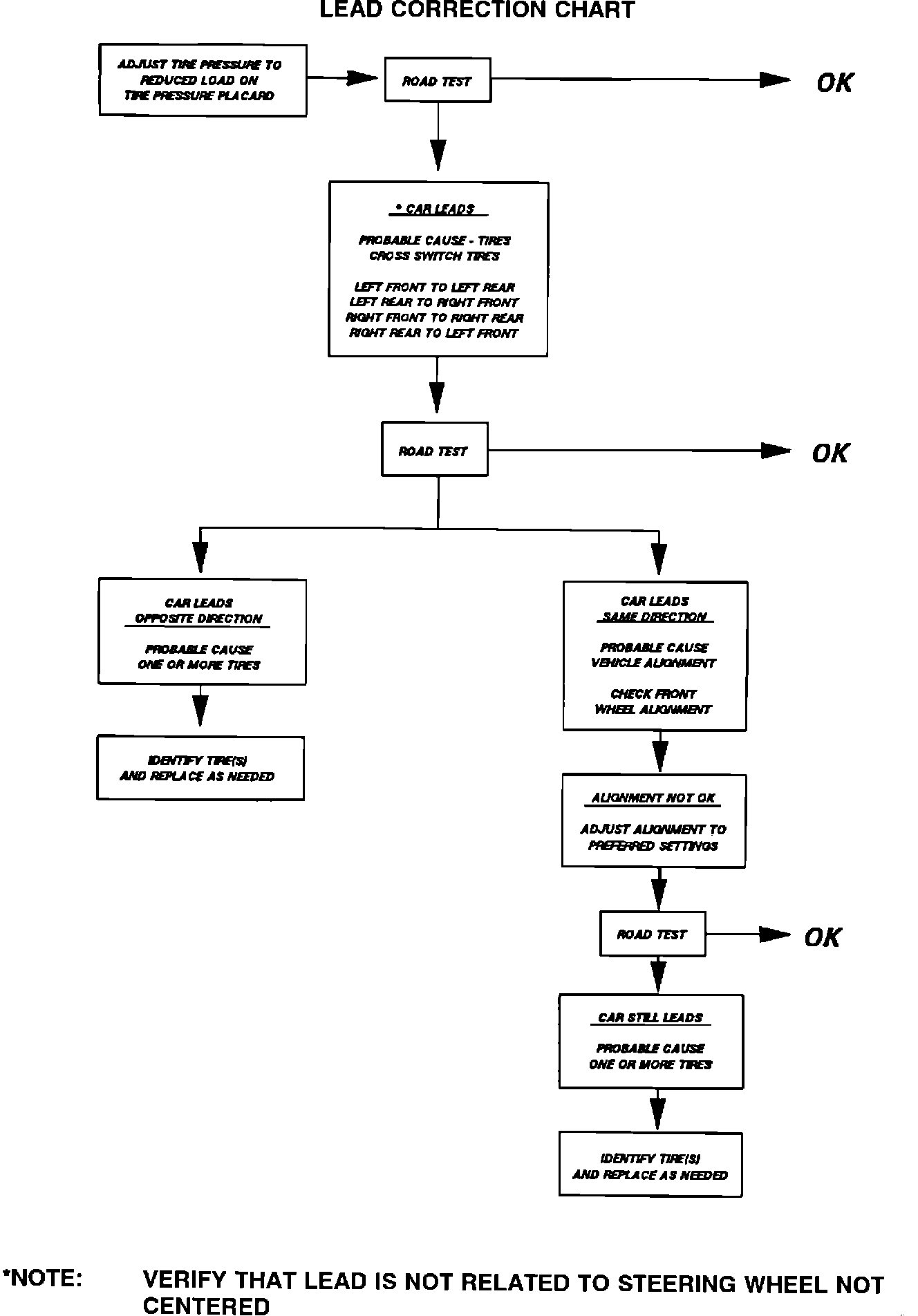 When servicing a vehicle for a lead or pull, refer to the revised Lead Correction Chart provided before proceeding with a wheel alignment repair. In many instances, cross switching tires or steering wheel centering are all that is required to correct the condition. Also, steering wheel centering may be all that is required.