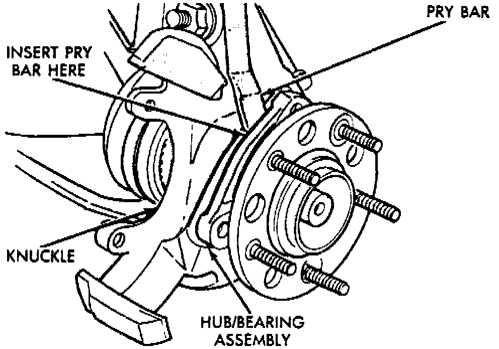 6. If hub and bearing will not slide out of knuckle, insert a pry bar between hub and steering knuckle and gently pry hub and bearing from knuckle.