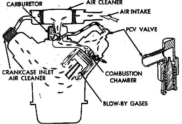 Crankcase vapors and piston blow-by are removed from the engine by manifold vacuum. These gases are drawn through the [1][2]PCV hose and into the intake plenum, they mix with the calibrated air/fuel mixture, and get burned and expelled with the exhaust gases.
