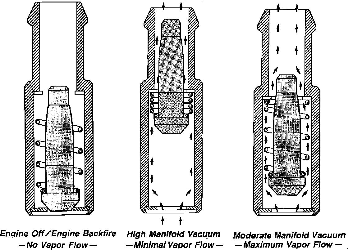 The amount of vapor drawn from the crankcase varies with intake manifold vacuum (engine load). When the engine is off or during intake manifold backfire, a spring the valve plunger preventing vapor flow. Under high intake manifold vacuum conditions (idle, and deceleration), the valve plunger allows minimal vapor flow. During moderate intake manifold vacuum conditions (cruise, light load), the valve plunger allows maximum vapor flow.