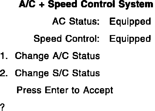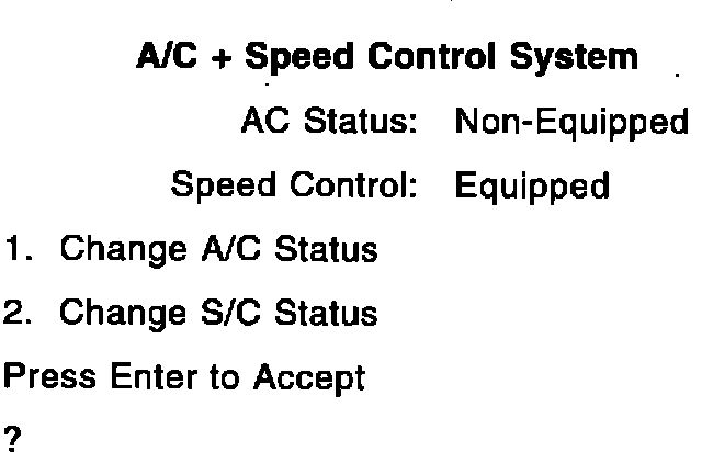 3. If either of the status indicators do not reflect the equipment found on the vehicle, press the corresponding number to toggle the status flag. For example, the vehicle above shows AC status Non-Equipped, the vehicle has Air Conditioning, pressing 1 causes the DRB III to display: