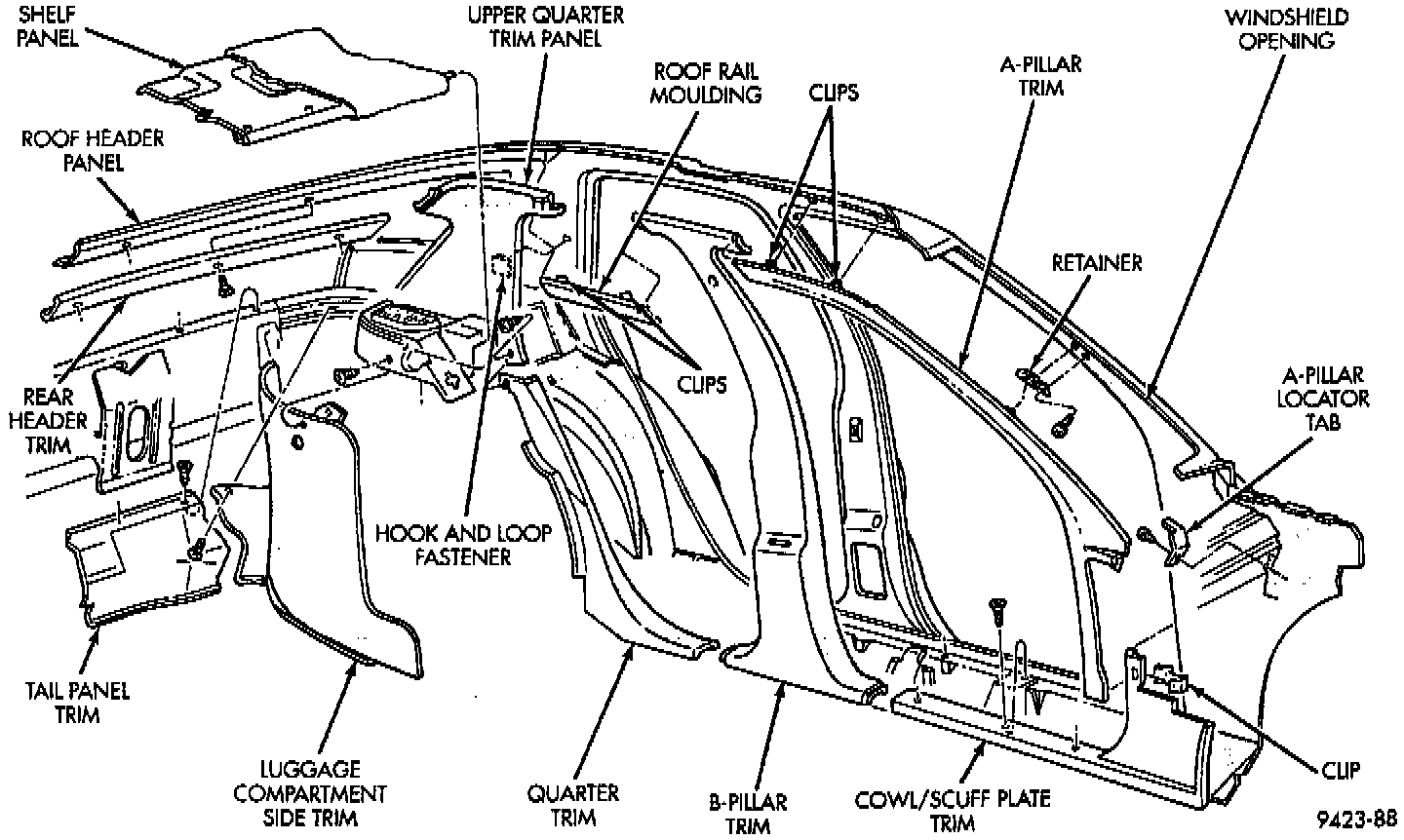 1. Remove roof rail mouldings and scuff plates as necessary.