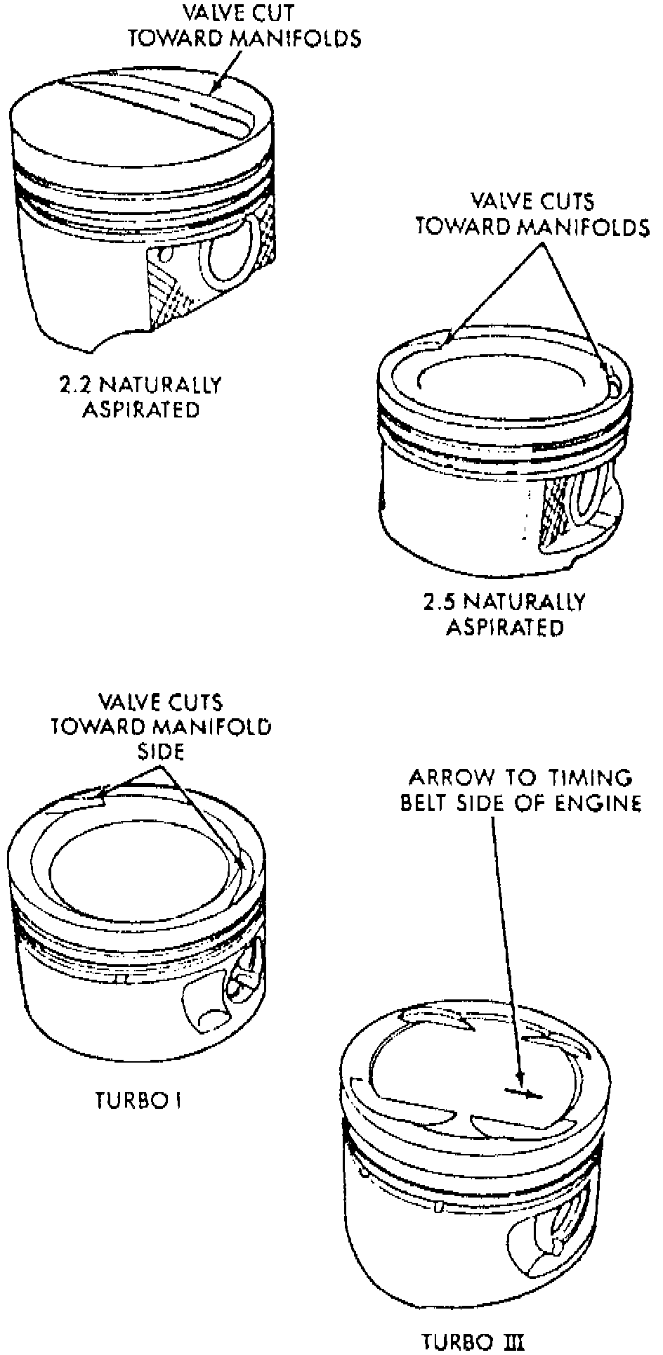 When installing piston and rod assembly, valve cut must face toward manifold side of engine. Turbocharged engine pistons will have an arrow or dimple toward front of engine. Oil hole on connecting rod must face timing belt side of engine.